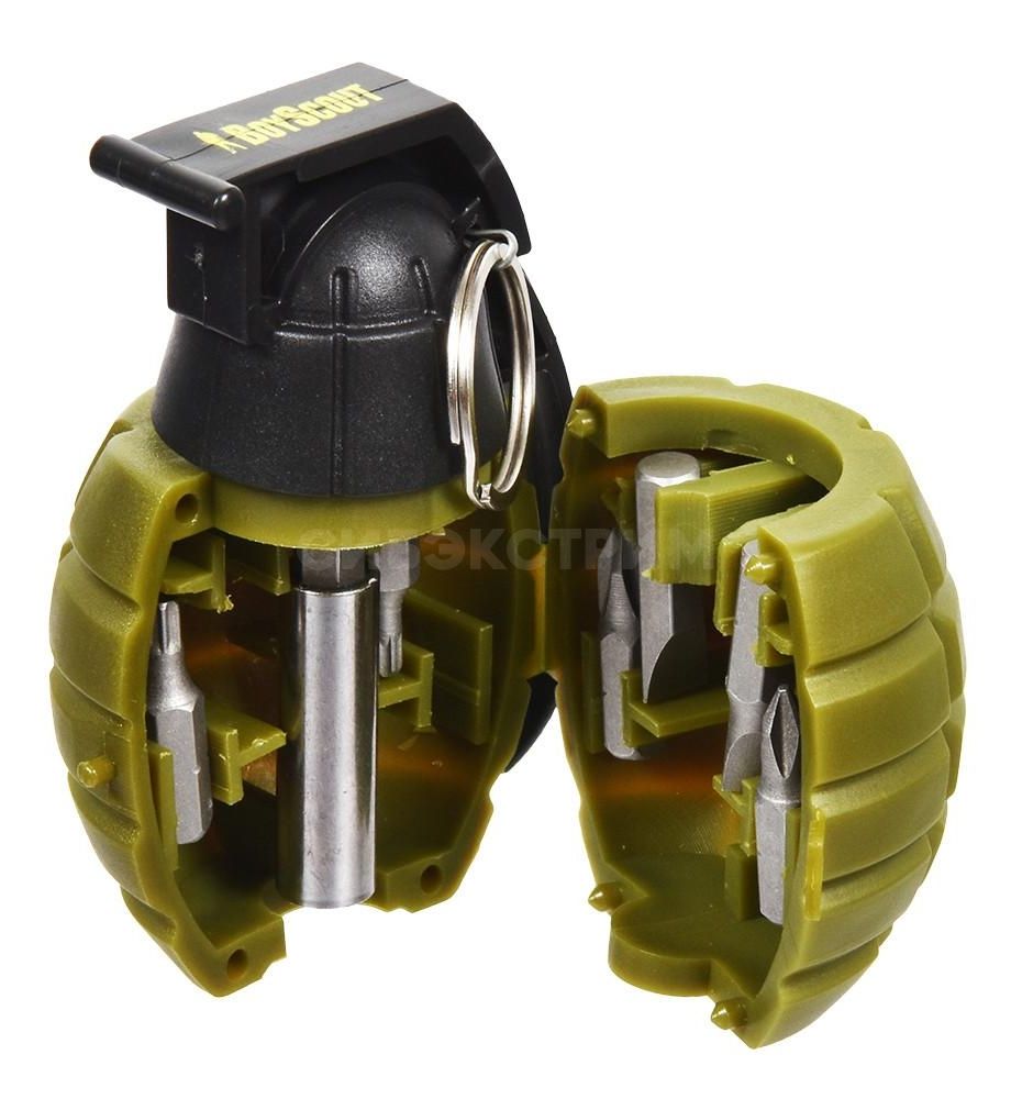 Мультиинструмент BOYSCOUT Ф-1 6 функций 61117 предназначен для дома и дачи. Он выполнен в виде гранаты с кольцом для подвески на ключи. В комплекте поставляется шесть бит и один магнитный адаптер-удлинитель. Изделия изготовлены из прочной углеродистой стали