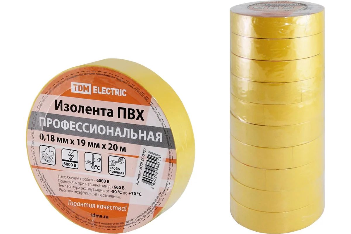 - Изолента TDM ПВХ, профессиональная, 0,18x19 мм, желтая, 20 м SQ0526-0062 выполнена из современных материалов, отличается небольшим весом, высоким коэффициентом растяжения.