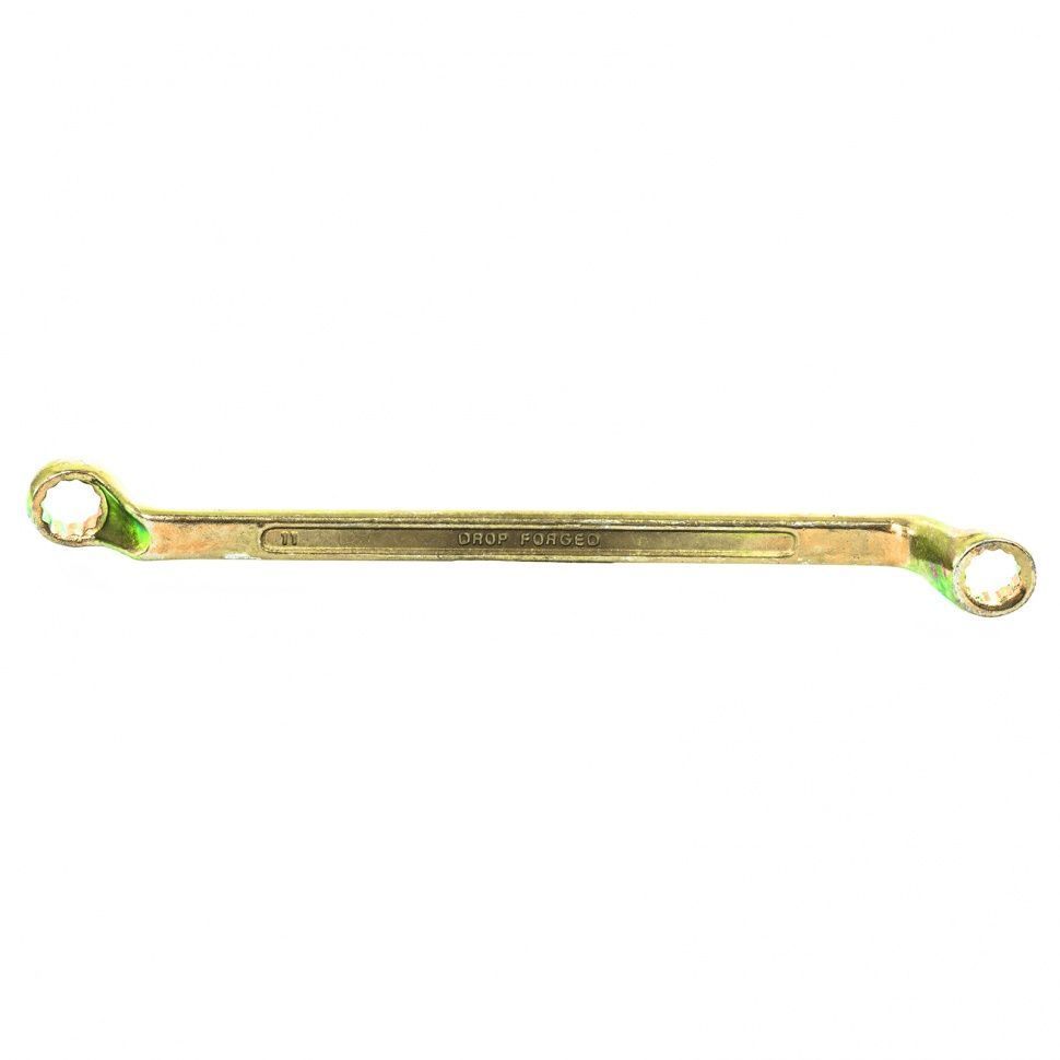 Накидной ключ Сибртех 14618 с покрытием из желтого цинка используется для монтажа и демонтажа резьбовых соединений с шестигранной головкой диаметром 10 и 13 мм. Позволяет осуществлять монтажные работы в гараже, на небольшом производстве и в быту. Кольцевой профиль полностью захватывает шляпку крепежного элемента, поэтому ключом легко откручивать даже закисшие болты, гайки и т.д. Преимущества Ключ изготовлен из качественной углеродистой стали 45, поэтому обладает прочностью и прослужит долгое время. Твердость рабочих частей составляет 42 HRC, что соответствует требованиям ГОСТ (41-46 HRC). Покрытие из желтого цинка гарантирует защиту от образования коррозии. 12-гранный профиль каждого кольцевого зева обеспечивает надежный захват крепежа по всему периметру и сводит к минимуму риск повреждения его граней. Рабочие части, смещенные относительно рукоятки, позволяют работать ключом в труднодоступных местах.