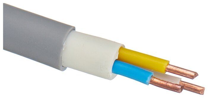 NYM 2х1,5 — силовой медный кабель с двумя жилами сечением 1,5 мм². Изоляция и оболочка выполнены из ПВХ-пластиката, между жилами есть мелонаполнение — негорючая заливка из невулканизированной резиновой смеси.