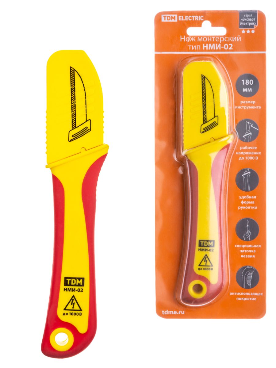 Монтерский нож с прямым лезвием TDM ЭкспертЭлектрик НМИ-02 диэлектрический SQ1003-0107 предназначен для снятия изоляции с проводников, разделки провода, снятия оболочки кабеля без повреждения остальных элементов конструкции кабеля. Изготовлен из закаленной высоколегированной стали, отличающейся высокой прочностью и долговечностью. Рукоятка ножа выполнена из специально проверенной изоляционной TPR-резины с антискользящим покрытием, что обеспечивает удобство при длительных монтажных работах.