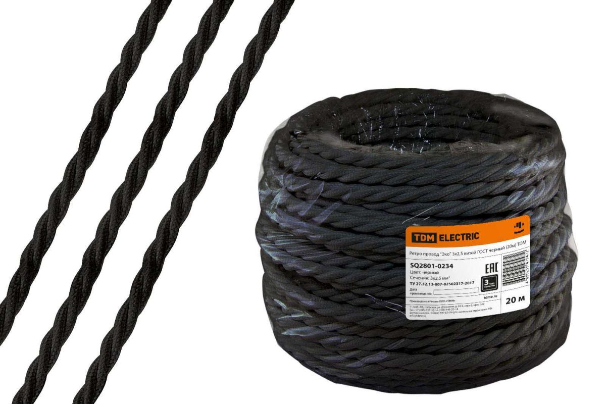 Ретро провод «Эко» 3х2,5 витой ГОСТ черный (20м) TDM