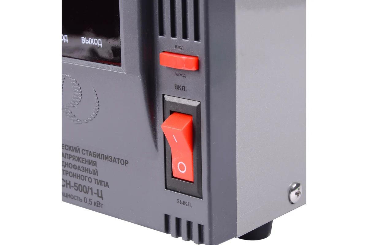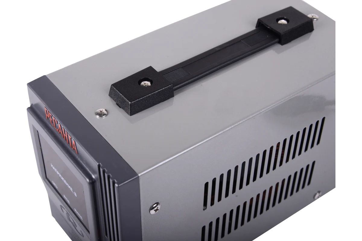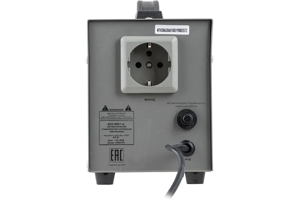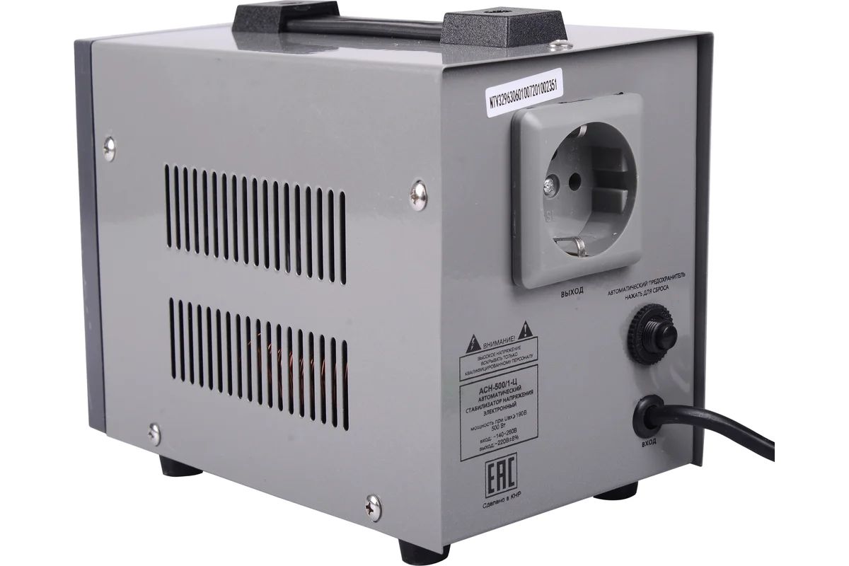 Стабилизатор напряжения Ресанта АСН-500/1-Ц предназначен для выравнивания сетевого напряжения в диапазоне от 140 В до 260 В до номинального в 220 В. Погрешность у данной линейки стабилизаторов составляет всего ±8%. Время срабатывания системы составляет 5-7 мс. Стабилизатор рассчитан на номинальную нагрузку в 0.5 кВт. Стабилизатор подключается к сети с помощью вилки. Для подключения электроприборов стабилизатор оснащён розеткой.