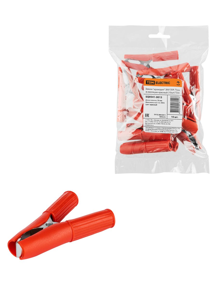 Зажим «крокодил» ЗКИ 30А 75мм в изоляции красный TDM